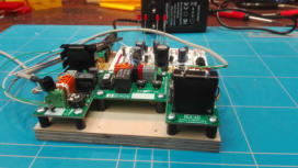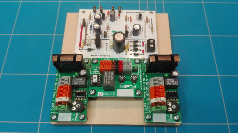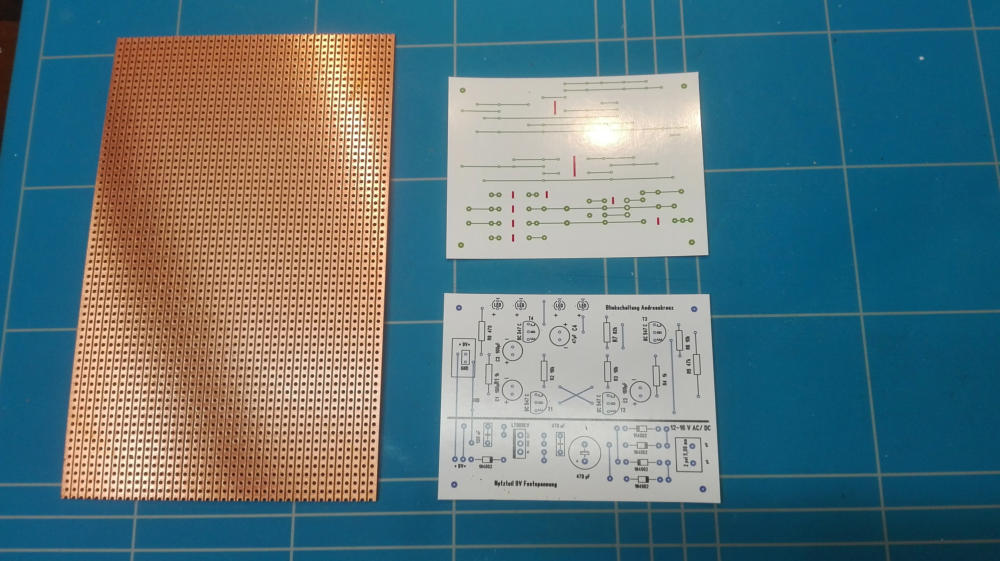 Streifenrasterplatine. Darunter die Variante mit integriertem Gleichrichter und 9 V Netzteil, d.h., die